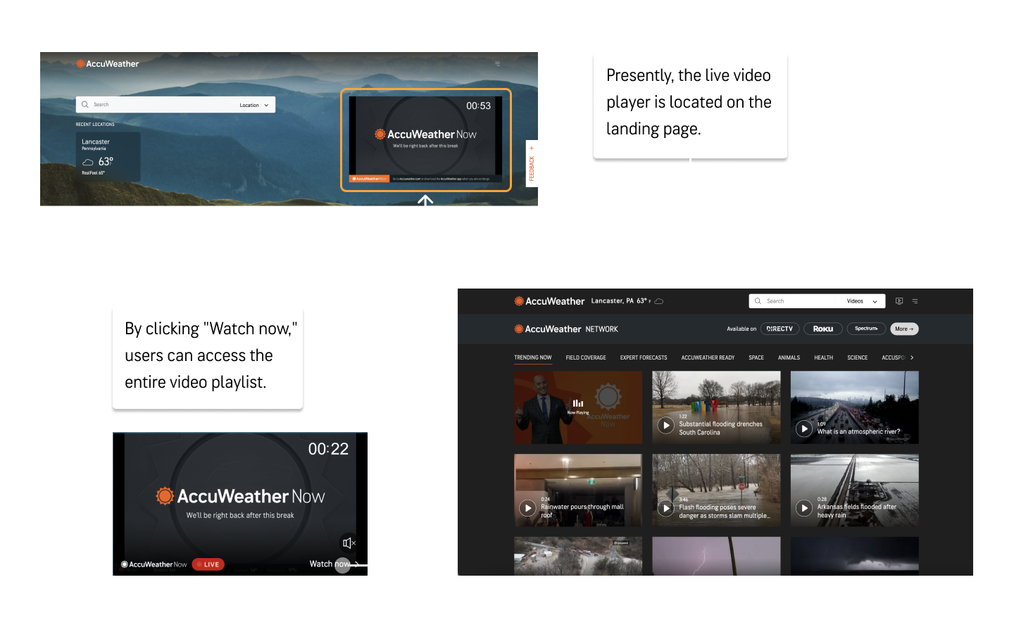 The web-version of AccuWeather Now, was at its initial stages. I found that it was a simple video player that would link users to a larger video wall. In-order to effectively create my own experiences I wanted to first look over the previously recorded user interviews.