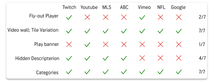 From this point I wanted an even closer look at what current users are familiar with, so I created a competitor analysis of seven of other companies that also use live video players on their platforms.