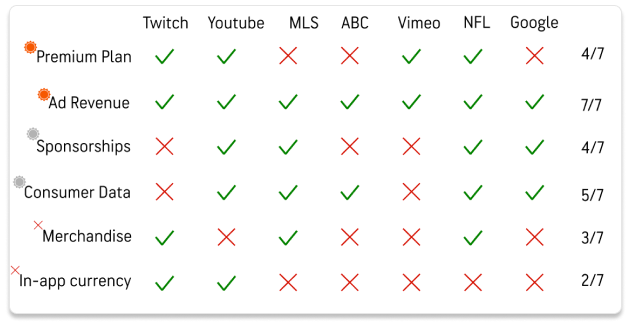I uncovered six primary revenue streams and categorized each with a color logo, a gray logo, and an X to denote the streams in use, potential new streams, and unlikely options, respectively.