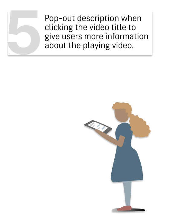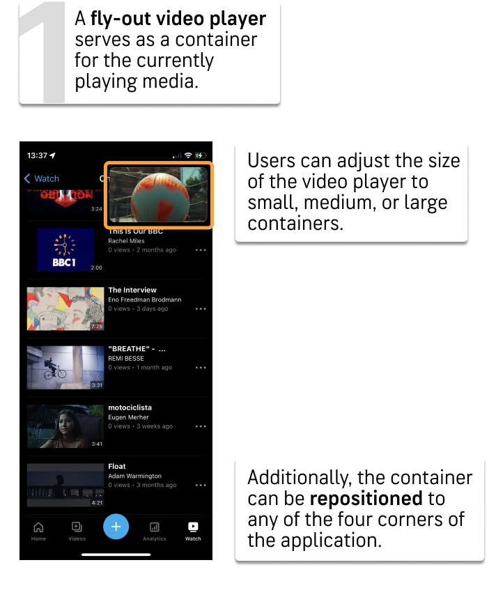 Considering both user and business objectives, the semi-circle design serves a dual purpose, ensuring the accessibility and non-intrusiveness of the video feature. The incorporated notification indicator stimulates user curiosity, encouraging exploration of this feature in an intuitive manner. In response to previous feedback sessions, particular attention was given to avoid obscuring any ad banners present in the live application, aligning the design with practical considerations and user experience optimization.