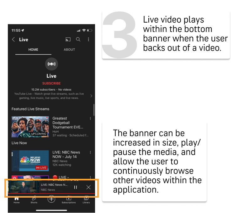 Positioned at the bottom of the screen with a subtle hover effect, the bar ensures easy visibility and draws attention in a discreet manner. Upon tapping the banner, it seamlessly expands into a fly-out video player, complete with intuitive buttons for play/pause, mute, and minimize.
