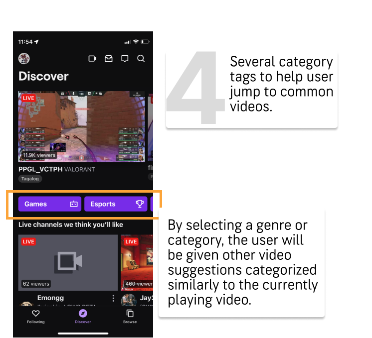 The user flow chart above illustrates the seamless process of switching between various videos by simply tapping on the desired selection. In the second figure, I introduced category tags inspired by my previous competitor research. This strategic addition aims to bring order to the potentially chaotic video overview page and assist users in locating specific types of videos, even when they may not know the exact name to search.